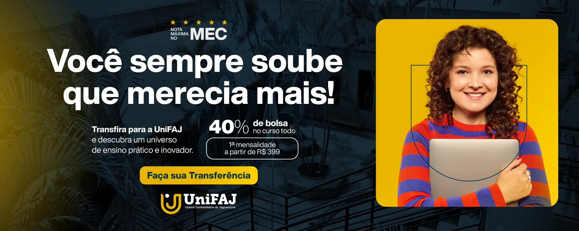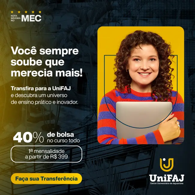 A UniFAJ é classificada com nota máxima (5) pelo MEC – Ministério da Educação em corpo docente, infraestrutura e Projeto Pedagógico do Curso (PPC).